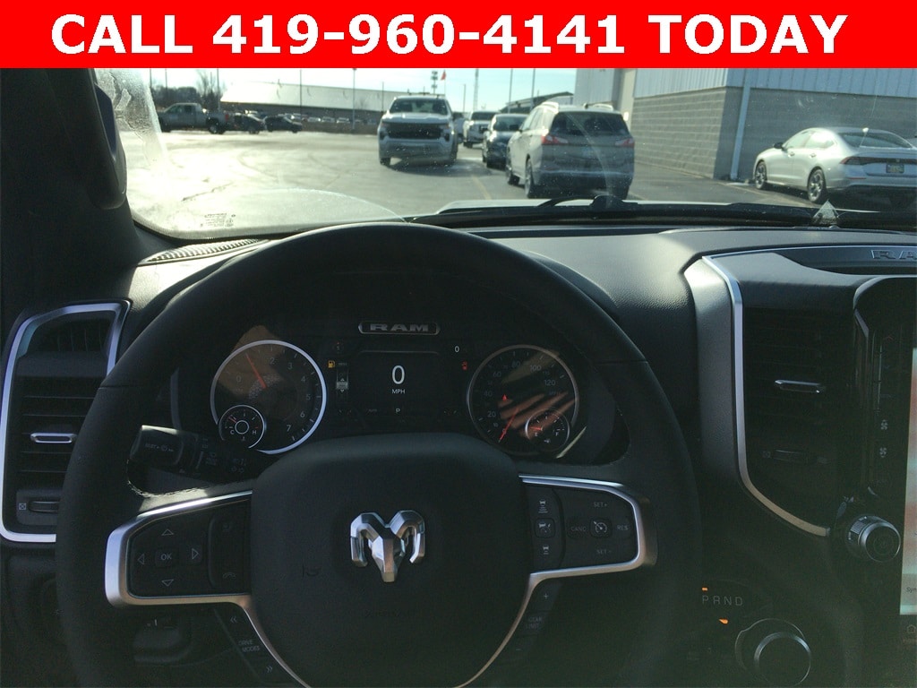 115V Auxiliary Power Outlet, 115V Auxiliary Rear Power Outlet, 12" Touchscreen Display, 2nd Row in Floor Storage Bins, 3 Rear Seat Head Restraints, 33 Gallon Fuel Tank, 4 Way Front Headrests, 4-Wheel Disc Brakes, 400W Inverter, 48V Belt Starter Generator, 4G LTE Wi-Fi Hot Spot, 6 Speakers, 9 Amplified Speakers with Subwoofer, ABS brakes, Accent Color Door Handles, Accent Color Premium Power Mirrors, Accent Color Tailgate Handle, Air Conditioning, Air Conditioning ATC with Dual Zone Control, Alloy wheels, AM/FM radio, Anti-Spin Differential Rear Axle, Apple CarPlay, Apple CarPlay/Android Auto, Auto High-beam Headlights, Auto Power-Folding Mirrors, Auto-Dimming Exterior Driver Mirror, Auto-Dimming Rear-View Mirror, Big Horn Level 2 Equipment Group, Black Exterior Mirrors, Black Exterior Truck Badging, Black Headlamp Bezels, Black Interior Accents, Black Painted Exterior Mirrors Caps, Black Premium Power Mirrors, Black Tail Lamp Bezels, Body Color Fender Flares, Body Color Front Bumper, Body Color Rear Bumper with Step Pads, Brake assist, Bucket Seats, Bumpers: chrome, Center Console Parts Module, Cloth Bucket Seats, Cluster 7.0" TFT Color Display, Compass, Configurable Drive Mode, Connected Travel and Traffic Services, Connectivity - US/Canada, Convex Wide-Angle Exterior Mirror Insert, Delay-off headlights, Deluxe Cloth Bucket Seats, Disassociated Touchscreen Display, Driver door bin, Dual Exhaust with Black Tips, Dual front impact airbags, Dual front side impact airbags, Electronic Stability Control, Exterior Mirrors Courtesy Lamps, Exterior Mirrors with Heating Element, Exterior Mirrors with Supplemental Signals, Front anti-roll bar, Front Bucket Seats, Front Center Armrest w/Storage, Front fog lights, Front License Plate Bracket, Front reading lights, Front Seat Back Map Pockets, Front wheel independent suspension, Full Length Floor Console, Fully automatic headlights, Global Telematics Box Module, Glove Box Lamp, Google Android Auto, GPS Antenna Input, GPS Navigation, Grille Black Surround Black Mesh, HD Radio, Heated door mirrors, Heated Front Seats, Heated Steering Wheel, Illuminated entry, Integrated Center Stack Radio, Integrated Voice Command with Bluetooth, Leather Wrapped Steering Wheel, LED Dome Lamp with on/Off Switch, LED Footwell Lighting, Low tire pressure warning, Manual Adjust 4-Way Driver Seat, Manual Adjust 4-Way Front Passenger Seat, Manual Folding Exterior Mirrors, Media Hub with 2 Charge Only USBs, MOPAR Front and Rear Rubber Floor Mats, Night Edition, Occupant sensing airbag, Outside temperature display, Overhead airbag, Overhead console, Overhead LED Lamps, Panic alarm, ParkView Rear Back-Up Camera, Passenger door bin, Passenger vanity mirror, Power 2-Way Driver Lumbar Adjust, Power Adjust 8-Way Driver Seat, Power Adjustable Pedals, Power door mirrors, Power steering, Power windows, Premium Overhead Console, Quick Order Package 27Z Big Horn, Radio data system, Radio: Uconnect 5 Navigation with 12.0" Display, Radio: Uconnect 5 W with 8.4" Display, RAM Grille Badge - Black, RAM Grille Badge - Chrome, Rear 60/40 Folding Seat, Rear anti-roll bar, Rear Center Armrest, Rear Power Sliding Window, Rear step bumper, Rear Wheelhouse Liners, Rear Window Defroster, Remote keyless entry, Remote Tailgate Release, Security Alarm, SiriusXM Radio Service, SiriusXM with 360L, Speed control, Steering Wheel Mounted Audio Controls, Sun Visors with Illuminated Vanity Mirrors, Supplier Part Tracking (J-1), Tachometer, Telescoping steering wheel, Tilt steering wheel, Traction control, Trailer Brake Control, Trip computer, Universal Garage Door Opener, USB Host Flip, Variably intermittent wipers, Voltmeter, Wheels: 20" x 9.0" Aluminum Painted Clad.